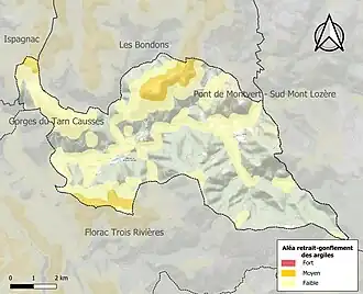 Le retrait-gonflement des sols argileux est susceptible d'engendrer des dommages importants aux bâtiments en cas d’alternance de périodes de sécheresse et de pluie. 6,3 % de la superficie communale est en aléa moyen ou fort (15,8 % au niveau départemental et 48,5 % au niveau national). Sur les 386 bâtiments dénombrés sur la commune en 2019, aucun n'est en aléa moyen ou fort, à comparer aux 14 % au niveau départemental et 54 % au niveau national. Une cartographie de l'exposition du territoire national au retrait gonflement des sols argileux est disponible sur le site du BRGM[20],[Carte 1].