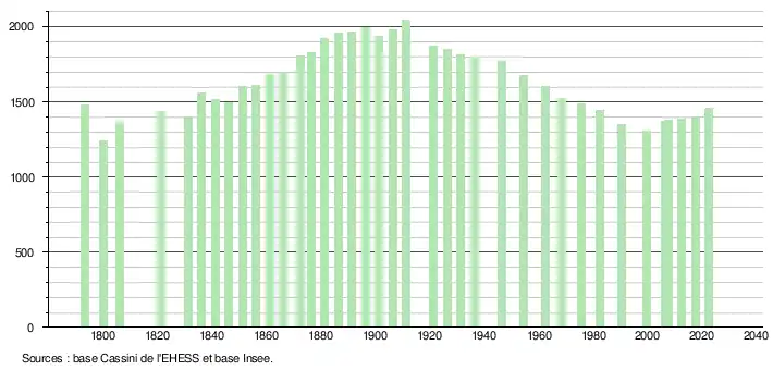 L'évolution du nombre d'habitants est connue à travers les recensements de la population effectués dans la commune depuis 1793. Pour les communes de moins de 10 000 habitants, une enquête de recensement portant sur toute la population est réalisée tous les cinq ans, les populations de référence des années intermédiaires étant quant à elles estimées par interpolation ou extrapolation[23]. Pour la commune, le premier recensement exhaustif entrant dans le cadre du nouveau dispositif a été réalisé en 2007[24].