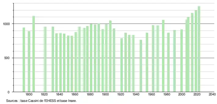 L'évolution du nombre d'habitants est connue à travers les recensements de la population effectués dans la commune depuis 1793. Pour les communes de moins de 10 000 habitants, une enquête de recensement portant sur toute la population est réalisée tous les cinq ans, les populations de référence des années intermédiaires étant quant à elles estimées par interpolation ou extrapolation[28]. Pour la commune, le premier recensement exhaustif entrant dans le cadre du nouveau dispositif a été réalisé en 2008[29].