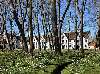À l'origine, en 1225, un groupe de jeunes femmes sans ressources, qui avaient fondé une association pieuse de béguines, décida de s’installer près d’un cours d’eau, dans un endroit isolé appelé « La Vigne »[note 1]. Cet endroit, situé à l'extérieur de la ville, leur permettrait de gagner leur vie en travaillant la laine pour les tisserands. Avec leurs consœurs des autres villes flamandes, les béguines brugeoises ont bouleversé l'ordre moral de l’Église, révolutionné les mentalités et modifié le paysage de nombreuses villes de Flandre.