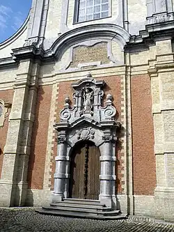 La façade fut finalement achevée en 1765, selon les plans d’Engelbert Baets, qui en dessina la partie supérieure ainsi que le clocheton octogonal à claire-voie posé sur le sommet cintré du pignon. Bien que neveu et disciple de l’architecte rococo anversois Jean-Pierre van Baurscheit le Jeune, Baets penchait à cette époque vers le néo-classicisme, et s’efforça de combiner le rococo (pignon, couronnement de la façade) et le classicisme (clocheton ajouré) ; une rupture de style reste cependant perceptible entre les parties inférieure et supérieure de la façade. Telle quelle, celle-ci séduit par le jeu des différents types de matériau utilisés (brique rouge, pierre bleuâtre ou jaunâtre) et par les effets de relief que crée la juxtaposition de champs en saillie et en retrait. L’articulation de la façade en trois travées, soulignée par des pilastres annelés, reflète la structuration en trois vaisseaux de la nef. Lesdits pilastres supportent une corniche profilée, au-dessus de laquelle se dresse la partie supérieure, flanquée de pilastres en creux et d’ailerons monumentaux, et percée d’une grande baie à arc surbaissé, marquée par une corniche. Au-dessus, le pignon s’achève par une horloge couverte d’une coquille rococo. Le portail d’entrée, richement orné, est flanqué de colonnes demi-engagées annelées se terminant par des chapiteaux doriques, lesquels supportent un entablement profilé présentant en son centre un arc en mitre ; le portail est surmonté d’un édicule à niche, enserré entre des ailerons en volute, dans lequel est logée une statue de sainte Marguerite, œuvre de D’Heur.