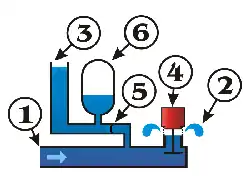 Le coup de bélier se produit, et le clapet anti-retour (5), ayant une pression amont soudainement plus grande que la pression aval (3 et 6), s'ouvre. L'eau monte alors à la fois dans la cloche (6) — qui sert de tampon pour absorber une partie du choc du coup de bélier et pour réguler le débit du refoulement — et dans la conduite de refoulement (3).