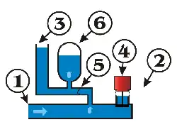 Au début du fonctionnement, le clapet anti-retour (5) est fermé sous l'effet de la pression statique de la colonne (3) et l'eau arrive par la conduite. L'eau s'échappe à l'extérieur du dispositif en (2) par la soupape primaire (4), mais celle-ci se ferme brusquement quand l'eau atteint une vitesse suffisante.