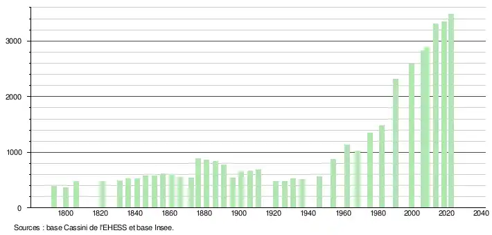 L'évolution du nombre d'habitants est connue à travers les recensements de la population effectués dans la commune depuis 1793. Pour les communes de moins de 10 000 habitants, une enquête de recensement portant sur toute la population est réalisée tous les cinq ans, les populations de référence des années intermédiaires étant quant à elles estimées par interpolation ou extrapolation[22]. Pour la commune, le premier recensement exhaustif entrant dans le cadre du nouveau dispositif a été réalisé en 2008[23].