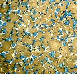 Les minéraux du clinker de ciment Portland peuvent être observés et quantifiés par microscopie pétrographique. Les nodules de clinker sont coupés et broyés en une surface plane et polie. Les minéraux exposés sont rendus visibles et identifiables en gravant la surface. La surface peut alors être observée en lumière réfléchie par microscopie optique. Dans l'exemple, un nodule de clinker a été poli et attaqué avec de la vapeur de fluorure d'hydrogène. L'alite apparaît en marron, la bélite en bleu et les phases fondues en blanc. La microscopie électronique peut également être utilisée, auquel cas les minéraux peuvent être identifiés par analyse à la microsonde . La méthode privilégiée pour quantifier avec précision les minéraux est la diffraction des rayons X sur le clinker en poudre, en utilisant la technique d'analyse de Rietveld. La bélite est beaucoup plus difficile à broyer dans un broyeur à ciment que l'alite.