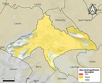 Le retrait-gonflement des sols argileux est susceptible d'engendrer des dommages importants aux bâtiments en cas d’alternance de périodes de sécheresse et de pluie. 76,1 % de la superficie communale est en aléa moyen ou fort (44,5 % au niveau départemental et 48,5 % au niveau national). Sur les 224 bâtiments dénombrés sur la commune en 2019, 224 sont en aléa moyen ou fort, soit 100 %, à comparer aux 75 % au niveau départemental et 54 % au niveau national. Une cartographie de l'exposition du territoire national au retrait gonflement des sols argileux est disponible sur le site du BRGM[21],[Carte 3].