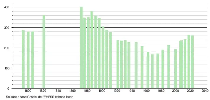 L'évolution du nombre d'habitants est connue à travers les recensements de la population effectués dans la commune depuis 1793. Pour les communes de moins de 10 000 habitants, une enquête de recensement portant sur toute la population est réalisée tous les cinq ans, les populations de référence des années intermédiaires étant quant à elles estimées par interpolation ou extrapolation[21]. Pour la commune, le premier recensement exhaustif entrant dans le cadre du nouveau dispositif a été réalisé en 2007[22].