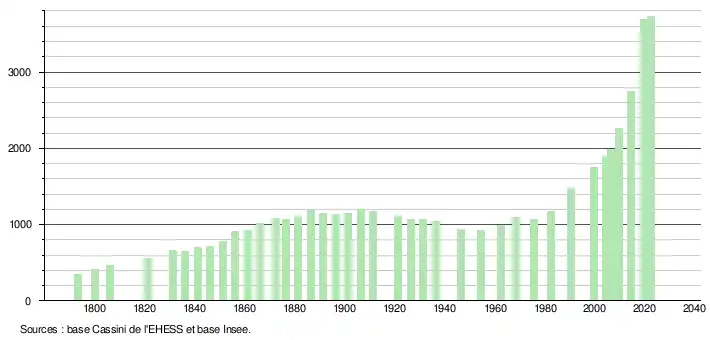 | L'évolution du nombre d'habitants est connue à travers les recensements de la population effectués dans la commune depuis 1793. Pour les communes de moins de 10 000 habitants, une enquête de recensement portant sur toute la population est réalisée tous les cinq ans, les populations de référence des années intermédiaires étant quant à elles estimées par interpolation ou extrapolation[25]. Pour la commune, le premier recensement exhaustif entrant dans le cadre du nouveau dispositif a été réalisé en 2004[26]. En 2022, la commune comptait 3 733 habitants[Note 3], en évolution de +24,02 % par rapport à 2016 (Landes : +5,78 %, France hors Mayotte : +2,11 %). |
