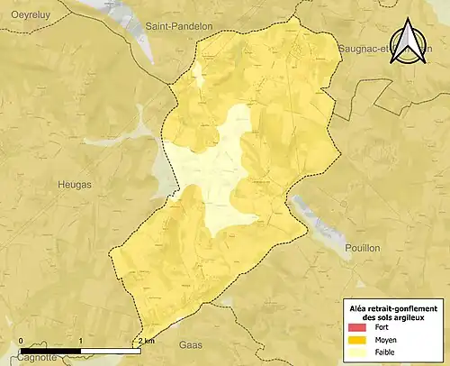 Le retrait-gonflement des sols argileux est susceptible d'engendrer des dommages importants aux bâtiments en cas d’alternance de périodes de sécheresse et de pluie. 86,5 % de la superficie communale est en aléa moyen ou fort (19,2 % au niveau départemental et 48,5 % au niveau national). Sur les 241 bâtiments dénombrés sur la commune en 2019, 180 sont en aléa moyen ou fort, soit 75 %, à comparer aux 17 % au niveau départemental et 54 % au niveau national. Une cartographie de l'exposition du territoire national au retrait gonflement des sols argileux est disponible sur le site du BRGM[18],[Carte 2].