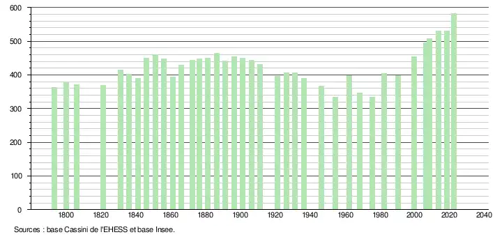 - ↑ Population municipale de référence en vigueur au 1er janvier 2025, millésimée 2022, définie dans les limites territoriales en vigueur au 1er janvier 2024, date de référence statistique : 1er janvier 2022.
