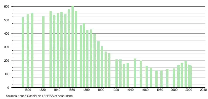 L'évolution du nombre d'habitants est connue à travers les recensements de la population effectués dans la commune depuis 1793. Pour les communes de moins de 10 000 habitants, une enquête de recensement portant sur toute la population est réalisée tous les cinq ans, les populations de référence des années intermédiaires étant quant à elles estimées par interpolation ou extrapolation[16]. Pour la commune, le premier recensement exhaustif entrant dans le cadre du nouveau dispositif a été réalisé en 2005[17].