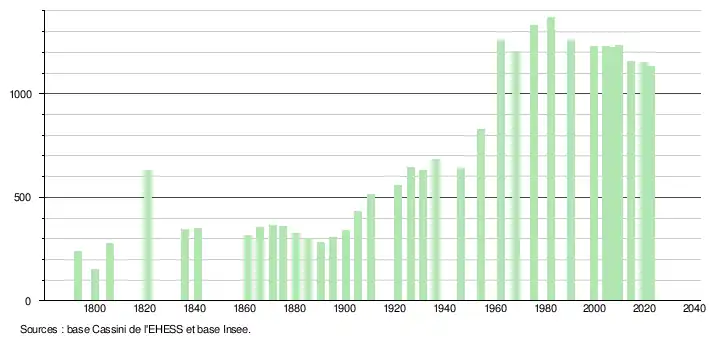 L'évolution du nombre d'habitants est connue à travers les recensements de la population effectués dans la commune depuis 1793. Pour les communes de moins de 10 000 habitants, une enquête de recensement portant sur toute la population est réalisée tous les cinq ans, les populations de référence des années intermédiaires étant quant à elles estimées par interpolation ou extrapolation[22]. Pour la commune, le premier recensement exhaustif entrant dans le cadre du nouveau dispositif a été réalisé en 2004[23].