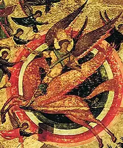À la tête de tous les rangs de soldats, est représenté l'archange Michel, prince des armées célestes, monté sur un cheval aux ailes de couleur de feu. Sa figure est comprise dans une mandorle sphérique de trois couleurs. C'est une représentation assez rare dans l'iconographie russe du XVIe siècle[19]:19. Il est placé aux portes de la Jérusalem céleste et en se retournant il appelle tous ceux qui le suivent. Le fait qu'il trouve une telle place dans cette icône est lié au fait que l'archange Michel était vénéré comme patron des lignées de souverains moscovites (Ivan le Terrible l'appelle dans ses écrits le complice de tous les tsars pieux)[24]. La cathédrale de l'Archange-Saint-Michel de Moscou est le lieu de sa sépulture.