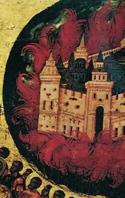 Dans la partie droite de l'icône est représentée une ville en feu. C'est la « ville du Malin » ou Sodome[1], abandonnée pour la nouvelle cité céleste[17]. Cette ville en feu représente Kazan, conquise par Ivan IV lors de sa campagne de 1552[18]. Selon l'historien d'art V. V. Morozov cette ville en feu n'est pas destinée à être détruite[19] par le feu, mais à être purifiée par lui[19]. Cette opinion est fondée sur le Livre dynastique, qui relate la description d'un témoin du siège de Kazan, le prêtre André (futur métropolite de Moscou sous le nom d'Athanase et auteur présumé de l'icône)[20]. Certains chercheurs voient dans le dessin de la ville en flamme la mosquée principale de Kazan détruite par Ivan le Terrible : la mosquée Qolsharif[21].