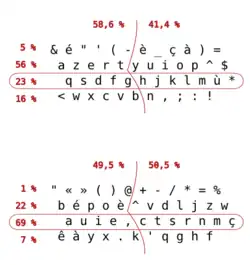 Fréquences d’utilisation des rangées et des mains dans les dispositions AZERTY et BÉPO.