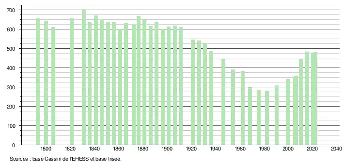 L'évolution du nombre d'habitants est connue à travers les recensements de la population effectués dans la commune depuis 1793. Pour les communes de moins de 10 000 habitants, une enquête de recensement portant sur toute la population est réalisée tous les cinq ans, les populations de référence des années intermédiaires étant quant à elles estimées par interpolation ou extrapolation[15]. Pour la commune, le premier recensement exhaustif entrant dans le cadre du nouveau dispositif a été réalisé en 2005[16].