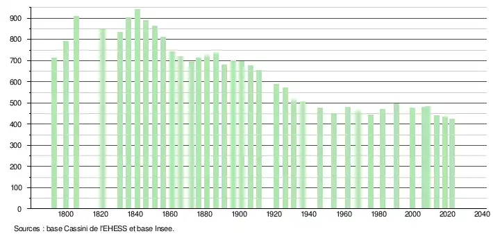 L'évolution du nombre d'habitants est connue à travers les recensements de la population effectués dans la commune depuis 1793. Pour les communes de moins de 10 000 habitants, une enquête de recensement portant sur toute la population est réalisée tous les cinq ans, les populations de référence des années intermédiaires étant quant à elles estimées par interpolation ou extrapolation[42]. Pour la commune, le premier recensement exhaustif entrant dans le cadre du nouveau dispositif a été réalisé en 2008[43].