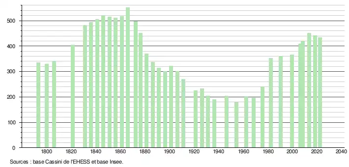 L'évolution du nombre d'habitants est connue à travers les recensements de la population effectués dans la commune depuis 1793. Pour les communes de moins de 10 000 habitants, une enquête de recensement portant sur toute la population est réalisée tous les cinq ans, les populations de référence des années intermédiaires étant quant à elles estimées par interpolation ou extrapolation[17]. Pour la commune, le premier recensement exhaustif entrant dans le cadre du nouveau dispositif a été réalisé en 2008[18].