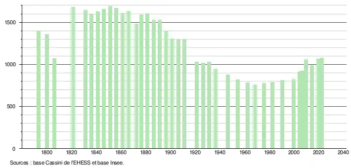 L'évolution du nombre d'habitants est connue à travers les recensements de la population effectués dans la commune depuis 1793. Pour les communes de moins de 10 000 habitants, une enquête de recensement portant sur toute la population est réalisée tous les cinq ans, les populations de référence des années intermédiaires étant quant à elles estimées par interpolation ou extrapolation[39]. Pour la commune, le premier recensement exhaustif entrant dans le cadre du nouveau dispositif a été réalisé en 2004[40].
