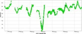 - ↑ (en) Edward F. Guinan et al., « The Fall and Rise in Brightness of Betelgeuse », sur The Astronomer's Telegram, (Bibcode 2020ATel13439....1G, consulté le )