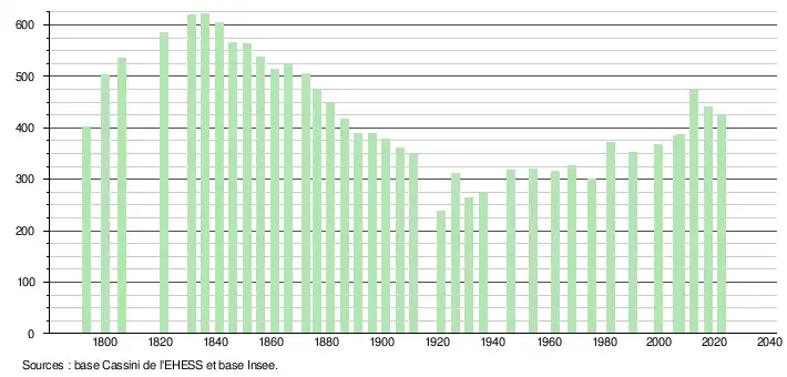 L'évolution du nombre d'habitants est connue à travers les recensements de la population effectués dans la commune depuis 1793. Pour les communes de moins de 10 000 habitants, une enquête de recensement portant sur toute la population est réalisée tous les cinq ans, les populations de référence des années intermédiaires étant quant à elles estimées par interpolation ou extrapolation[26]. Pour la commune, le premier recensement exhaustif entrant dans le cadre du nouveau dispositif a été réalisé en 2007[27].