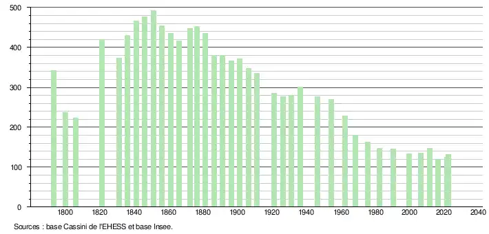 L'évolution du nombre d'habitants est connue à travers les recensements de la population effectués dans la commune depuis 1793. Pour les communes de moins de 10 000 habitants, une enquête de recensement portant sur toute la population est réalisée tous les cinq ans, les populations de référence des années intermédiaires étant quant à elles estimées par interpolation ou extrapolation[18]. Pour la commune, le premier recensement exhaustif entrant dans le cadre du nouveau dispositif a été réalisé en 2006[19].