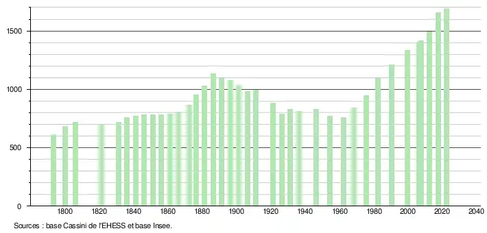 L'évolution du nombre d'habitants est connue à travers les recensements de la population effectués dans la commune depuis 1793. Pour les communes de moins de 10 000 habitants, une enquête de recensement portant sur toute la population est réalisée tous les cinq ans, les populations de référence des années intermédiaires étant quant à elles estimées par interpolation ou extrapolation[26]. Pour la commune, le premier recensement exhaustif entrant dans le cadre du nouveau dispositif a été réalisé en 2007[27].