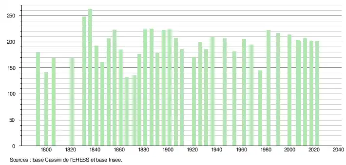 L'évolution du nombre d'habitants est connue à travers les recensements de la population effectués dans la commune depuis 1793. Pour les communes de moins de 10 000 habitants, une enquête de recensement portant sur toute la population est réalisée tous les cinq ans, les populations de référence des années intermédiaires étant quant à elles estimées par interpolation ou extrapolation[21]. Pour la commune, le premier recensement exhaustif entrant dans le cadre du nouveau dispositif a été réalisé en 2007[22].