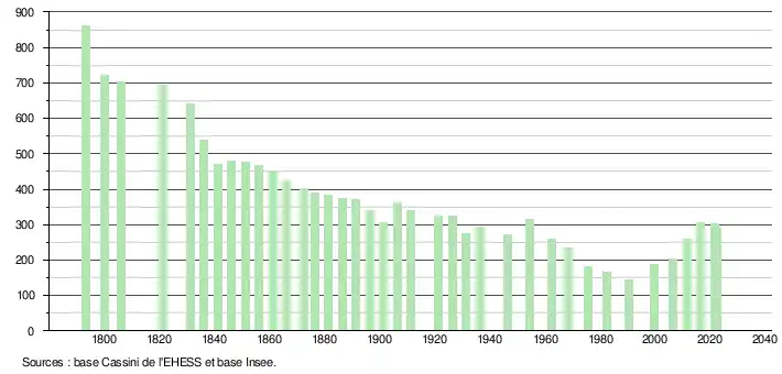L'évolution du nombre d'habitants est connue à travers les recensements de la population effectués dans la commune depuis 1793. Pour les communes de moins de 10 000 habitants, une enquête de recensement portant sur toute la population est réalisée tous les cinq ans, les populations de référence des années intermédiaires étant quant à elles estimées par interpolation ou extrapolation[24]. Pour la commune, le premier recensement exhaustif entrant dans le cadre du nouveau dispositif a été réalisé en 2006[25].