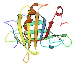 La β-lactoglobuline est une albumine de 18,36 kDa, qui se présente sous la forme d'un dimére à pH entre 3 et 7. Il en existe plusieurs variants.
