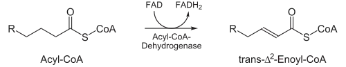 ![]() | Acyl-CoA déshydrogénase | Déshydrogénation par le FAD. La déshydrogénation, en présence de FAD, catalysée par une oxydo-réductase, l'acyl-CoA déshydrogénase, a lieu entre les carbones β et α (carbones 2 et 3 dans la nomenclature IUPAC). Il y a formation de trans-Δ2-énoyl-CoA en Cn.