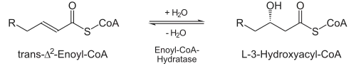 ![]() | Énoyl-CoA hydratase | Hydratation. Cette réaction d'addition est catalysée par une crotonase du groupe des lyases. Du fait de la proximité du groupe cétone, la double liaison est polarisée (le carbone β est δ+, le carbone α est δ-) : le groupe OH de l'eau se lie au carbone β avec formation de L-β-hydroxyacyl-CoA en Cn.