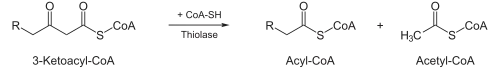 ![]() | Acétyl-CoA C-acyltransférase | Thiolyse. Cette réaction est catalysée par une transférase, la β-cétothiolase, en présence de coenzyme A, et conduit à la formation :