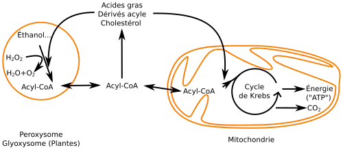 Dans les peroxysomes, ce sont avant tout les acides gras à longue et très longue chaîne qui sont dégradés, jusqu'à l'octanoyl-CoA — avec un résidu d'acide gras en C8. On pense que les acides gras à longue chaîne — à 22 atomes de carbone et plus — commencent par être oxydés dans les peroxysomes avant d'être entièrement dégradés par β-oxydation dans les mitochondries.