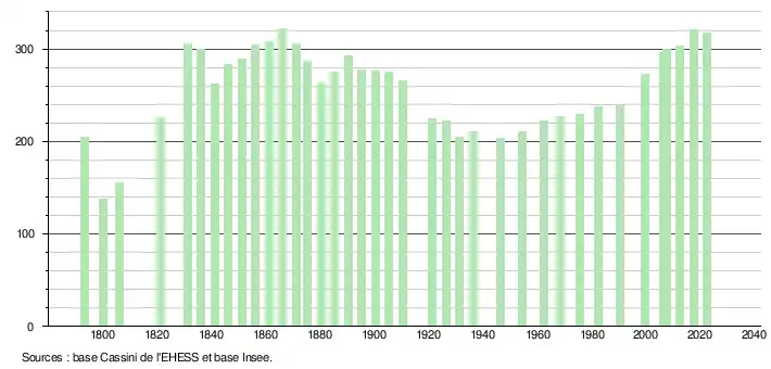 L'évolution du nombre d'habitants est connue à travers les recensements de la population effectués dans la commune depuis 1793. Pour les communes de moins de 10 000 habitants, une enquête de recensement portant sur toute la population est réalisée tous les cinq ans, les populations de référence des années intermédiaires étant quant à elles estimées par interpolation ou extrapolation[21]. Pour la commune, le premier recensement exhaustif entrant dans le cadre du nouveau dispositif a été réalisé en 2007[22].