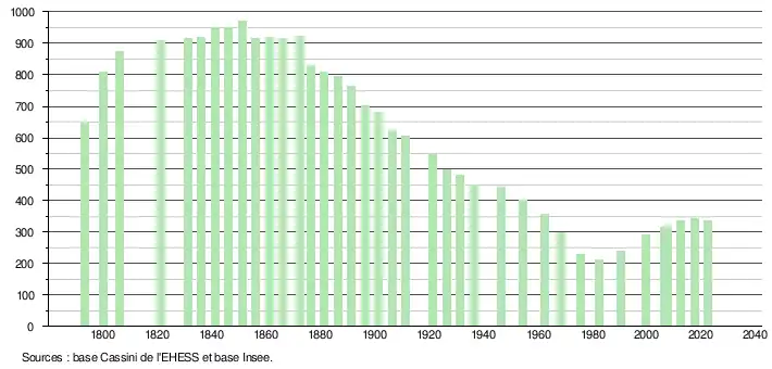 L'évolution du nombre d'habitants est connue à travers les recensements de la population effectués dans la commune depuis 1793. Pour les communes de moins de 10 000 habitants, une enquête de recensement portant sur toute la population est réalisée tous les cinq ans, les populations de référence des années intermédiaires étant quant à elles estimées par interpolation ou extrapolation[15]. Pour la commune, le premier recensement exhaustif entrant dans le cadre du nouveau dispositif a été réalisé en 2007[16].