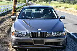 À l'automne 2000, la Série 5 a fait peau neuve. Les phares avant jumelés ont été remplacés et sont désormais entourés d'anneaux de feux de stationnement à technologie fibre optique. Les feux clignotants étaient désormais situés derrière la vitre de protection commune avec les phares. Les feux arrière ont également été convertis à la technologie de la fibre optique : quatre diodes électroluminescentes rouges de chaque côté alimentent quatre tiges lumineuses disposées horizontalement. Les anciens antibrouillards carrés ont été remplacés par des feux ronds et sont désormais de série sur tous les modèles. Le tablier avant a été redessiné, les pare-chocs étaient maintenant peints couleur carrosserie (sauf pour les véhicules avec la finition aérodynamique M) et les haricots BMW ont reçu des entourages chromés plus larges[13].