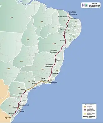 D'orientation généralement nord-sud, sa longueur totale est d'environ 4 385 km, passant par dix États, reliant des villes importantes telles que Porto Alegre, Curitiba, São Paulo, São José dos Campos, Rio de Janeiro, Pelotas, Governador Valadares, Teófilo Otoni, Vitória da Conquista, Feira de Santana et Fortaleza.