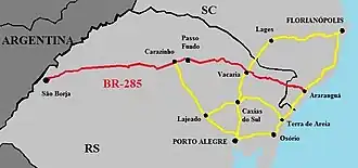 La BR-285 est une route transversale qui commence à Araranguá, État de Santa Catarina, et s'achève à São Borja, Rio Grande do Sul. Elle est en relativement bon état jusqu'à Timbé do Sul (Santa Catarina), mais en terre jusqu'à la limite avec le Rio Grande do Sul. Elle redevient en bon état sur le territoire de ce dernier. Elle comporte deux tronçons sous concession de compagnies privées, entre Vacaria et Lagoa Vermelha - 66 km — et Passo Fundo et Panambi - 120 km. Entre Bom Jesus et Vacaria, elle porte le nom populaire de « Rodovia da Maçã » (Route de la Pomme).