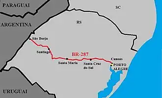 La BR-287 est une route fédérale transversale de l'État du Rio Grande do Sul qui commence à Montenegro et s'achève à São Borja. Elle est en bon état sur tout son parcours. Elle comporte un tronçon sous concession de compagnies privées, entre Tabaí et Paraíso do Sul, district de Rincão da Porta - 147 km. Elle partage un morceau de 20 km avec la BR-153, entre Candelária et Novos Cabrais.