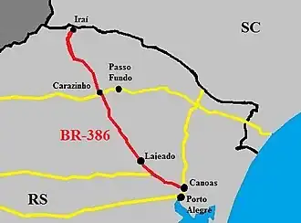 La BR-386 est une route fédérale diagonale brésilienne qui relie Iporã do Oeste, dans l'État de Santa Catarina, à Canoas, dans l'État du Rio Grande do Sul. La route est sous concession privée entre Sarandi et Tabaí et, de ce fait, soumise à péage. Son tronçon entre Mondaí (Santa Catarina) et la limite avec le Rio Grande do Sul, sur le rio Uruguai, n'est pas construit ou en cours.
