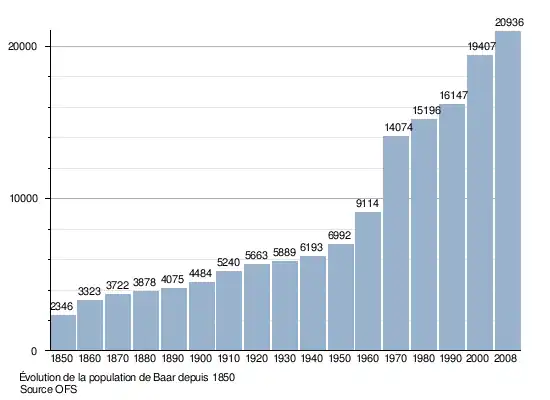 Le graphique suivant résume l'évolution de la population de Baar entre 1850 et 2008[3] :