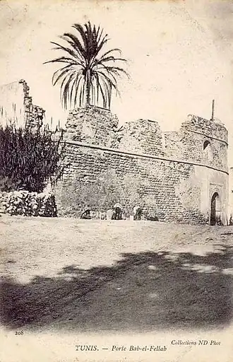 « Tout à côté de Bab-Alioua se trouve une porte très curieuse : de son bastion s'élance un palmier qui lui fait un super panache. Mais cette porte a moins d'importance, ne donnant pas accès, comme sa voisine, à l'une des grandes artères de la ville. Son nom, Bab-el-Fellah, signifie « porte des agriculteurs » ou de l'agriculture. C'est par elle que l'on débouche sur les superbes collines cultivées qui entourent Tunis au sud[2]. »