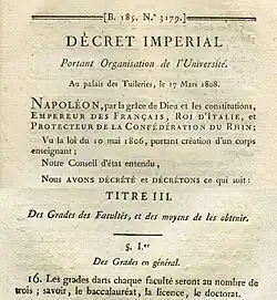 Après la Révolution française qui supprime les universités, le baccalauréat a été réorganisé pour les cinq disciplines (sciences, lettres, droit, médecine, théologie) par Napoléon Ier en 1808, avec les deux autres grades, la licence et le doctorat. Le baccalauréat devient alors un grade universitaire d'État. Le décret du 17 mars 1808 fixe les règles à suivre pour obtenir ces grades : Article 1. « L’enseignement public, dans tout l'Empire, est confié exclusivement à l'Université. » L’Université impériale organise ainsi le contrôle des compétences avec la création de trois grades universitaires, baccalauréat, licence et doctorat, conditions d’accès au métier d’enseignant.
