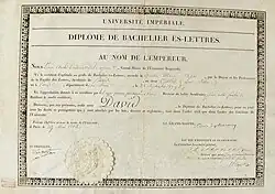 Le baccalauréat est créé en 1808[11], mais sa première édition n'a lieu qu'en 1809. Cette année inaugurale ne voit que 31 bacheliers (30 bacheliers es lettres, 1 bachelier es lettres et es sciences). Fait curieux, l'Académie de Paris ne présente aucun candidat. L'Académie de Douai en compte 10, celle d'Amiens 9, celle de Strasbourg 7, et celle de Rennes 4. On délivre plus d'un millier de diplômes en 1812, plus de deux mille en 1816[12].