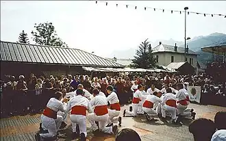 La danse est effectuée par neuf hommes habillés entièrement en blanc à l’exception d’un très petit nœud noir autour du cou, d’une large ceinture rouge et de chaussures, de type ballerines et de couleur noire. Les hommes forment un cercle, se saluent et exécutent des formes géométriques avec leurs épées. Le groupe se compose de neuf danseurs, deux porte‐emblèmes, sept à huit chanteuses, et quatre à cinq accompagnateurs ou remplaçants[6]