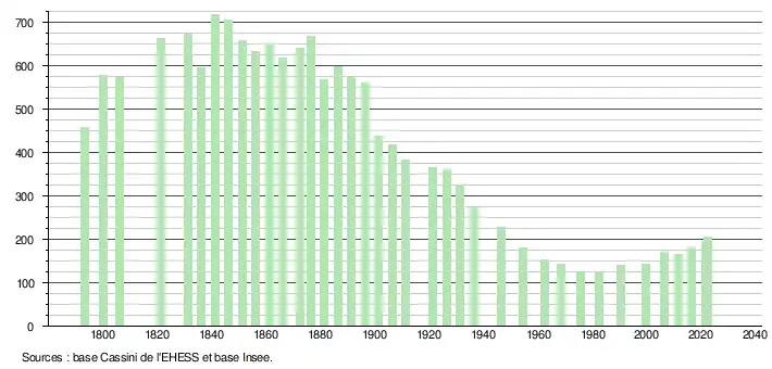 | L'évolution du nombre d'habitants est connue à travers les recensements de la population effectués dans la commune depuis 1793. Pour les communes de moins de 10 000 habitants, une enquête de recensement portant sur toute la population est réalisée tous les cinq ans, les populations de référence des années intermédiaires étant quant à elles estimées par interpolation ou extrapolation[33]. Pour la commune, le premier recensement exhaustif entrant dans le cadre du nouveau dispositif a été réalisé en 2006[34]. En 2022, la commune comptait 207 habitants[Note 4], en évolution de +14,36 % par rapport à 2016 (Lot : +1,31 %, France hors Mayotte : +2,11 %). |