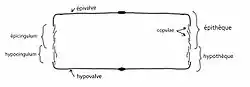 Le frustule est composé de deux parties ou thèques s'emboîtant l'une dans l'autre, à la manière d'une boîte. Chacune de ces deux parties est elle-même composée de deux éléments. Le premier, la valve, plus ou moins bombée (rarement plate), correspond à la face du « couvercle » ou du « fond » de la « boîte » ; à sa périphérie peut se situer une zone oblique ou verticale, le manteau, qui fait la liaison avec le second élément. Ce second élément, le cingulum, est une paroi verticale entourant la valve qui peut être formé d'une simple bande siliceuse ou comporter plusieurs bandes ou segments cingulaires (copulae). L'épithèque est constituée de l'épivalve et de l'épicingulum et correspond à la partie du frustule correspondant au « couvercle » ; l'hypothèque, plus petite, est constituée de l'hypocingulum et de l'hypovalve, et désigne le « fond » (voir la figure, d'après Van den Hoek, 1995). Le volume interne du frustule, occupé par la cellule, peut être partiellement subdivisé par des cloisons, perforées ou incomplètes, portées par les valves ou par les bandes cingulaires.