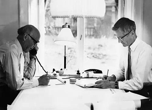 Les deux architectes sont aussi positionnés sur un créneau tout à fait différent, à savoir les bâtiments commerciaux. Pour le compte du constructeur Svenska Bostäder, ils réalisent les centres commerciaux Vällingby Centrum (1953-55) et Farsta Centrum (1956-60). Les deux zones urbaines sont construites selon le nouveau concept de ville ABC, qui réunit en un même lieu travail, logements et commerces.
