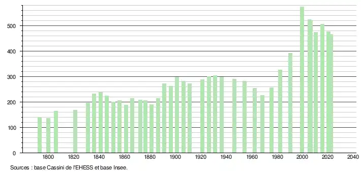 L'évolution du nombre d'habitants est connue à travers les recensements de la population effectués dans la commune depuis 1793. Pour les communes de moins de 10 000 habitants, une enquête de recensement portant sur toute la population est réalisée tous les cinq ans, les populations de référence des années intermédiaires étant quant à elles estimées par interpolation ou extrapolation[35]. Pour la commune, le premier recensement exhaustif entrant dans le cadre du nouveau dispositif a été réalisé en 2005[36].